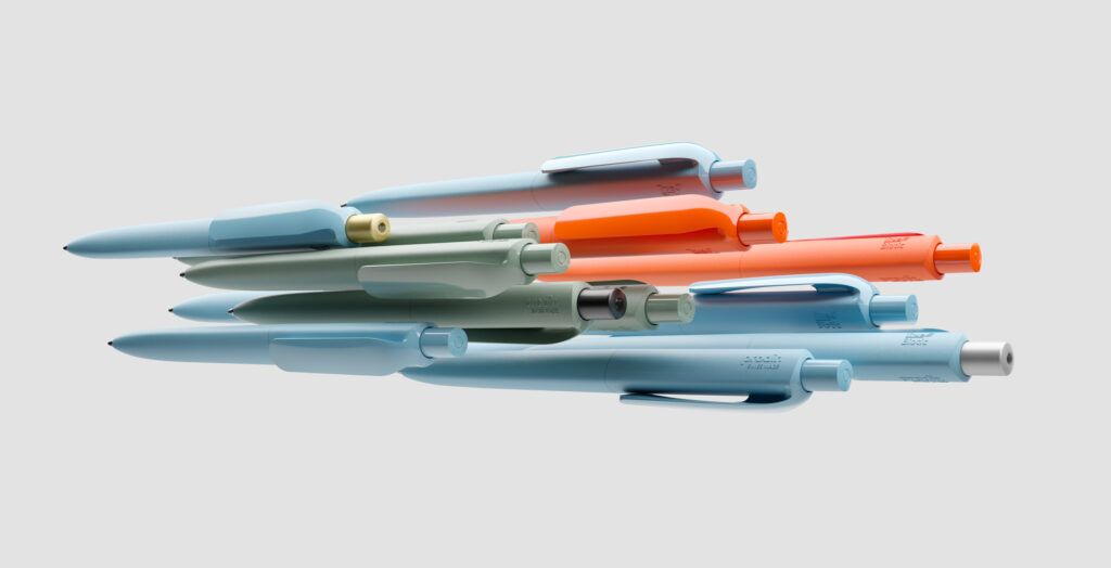 Strumenti da scrittura realizzati in modo sostenibile con materiali speciali e innovativi, composti da materiali derivati da plastica o alluminio riciclati a livello regionale, oppure realizzati in biopolimeri (PHA) che non contengono plastica.